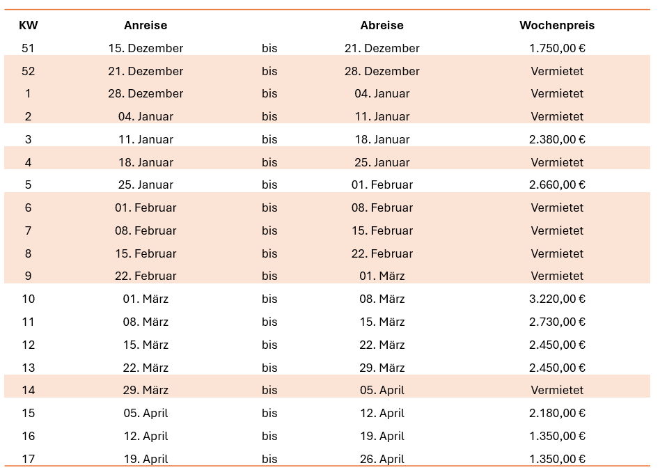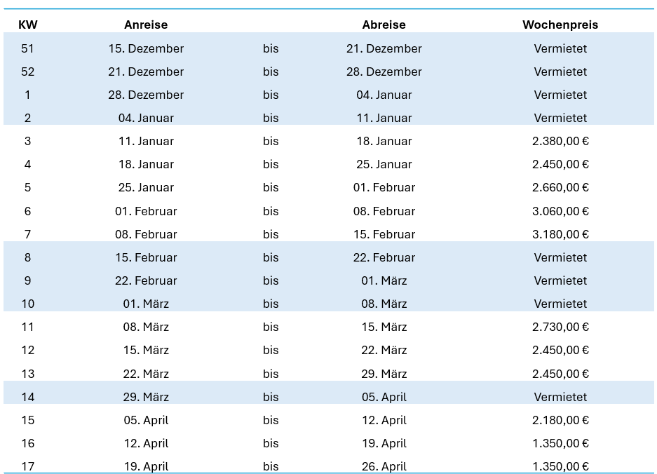 Die unten stehenden Preise beinhalten die Endreinigung und Bettwäsche. Die Betten werden vor Ihrer Ankunft bezogen.