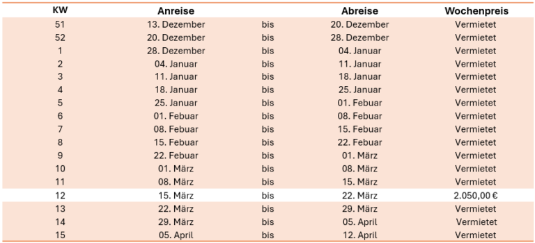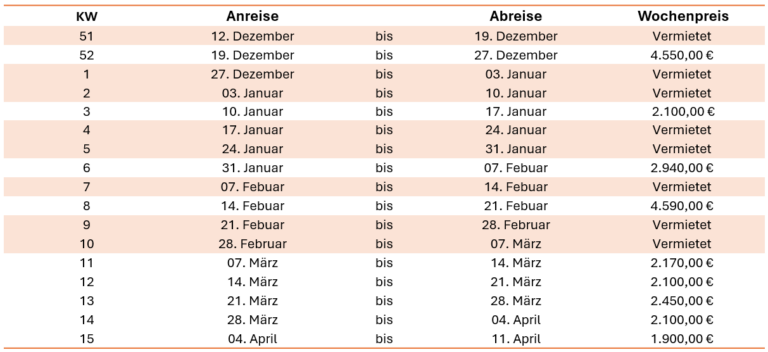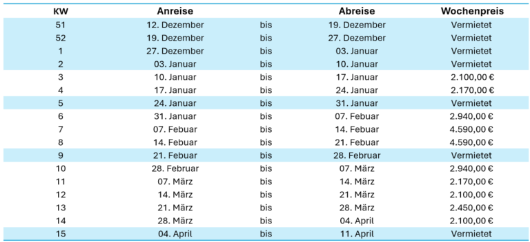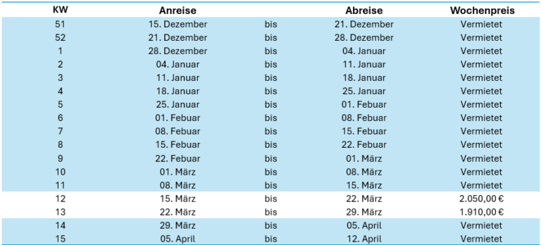 Die unten stehenden Preise beinhalten die Endreinigung und Bettwäsche. Die Betten werden vor Ihrer Ankunft bezogen.